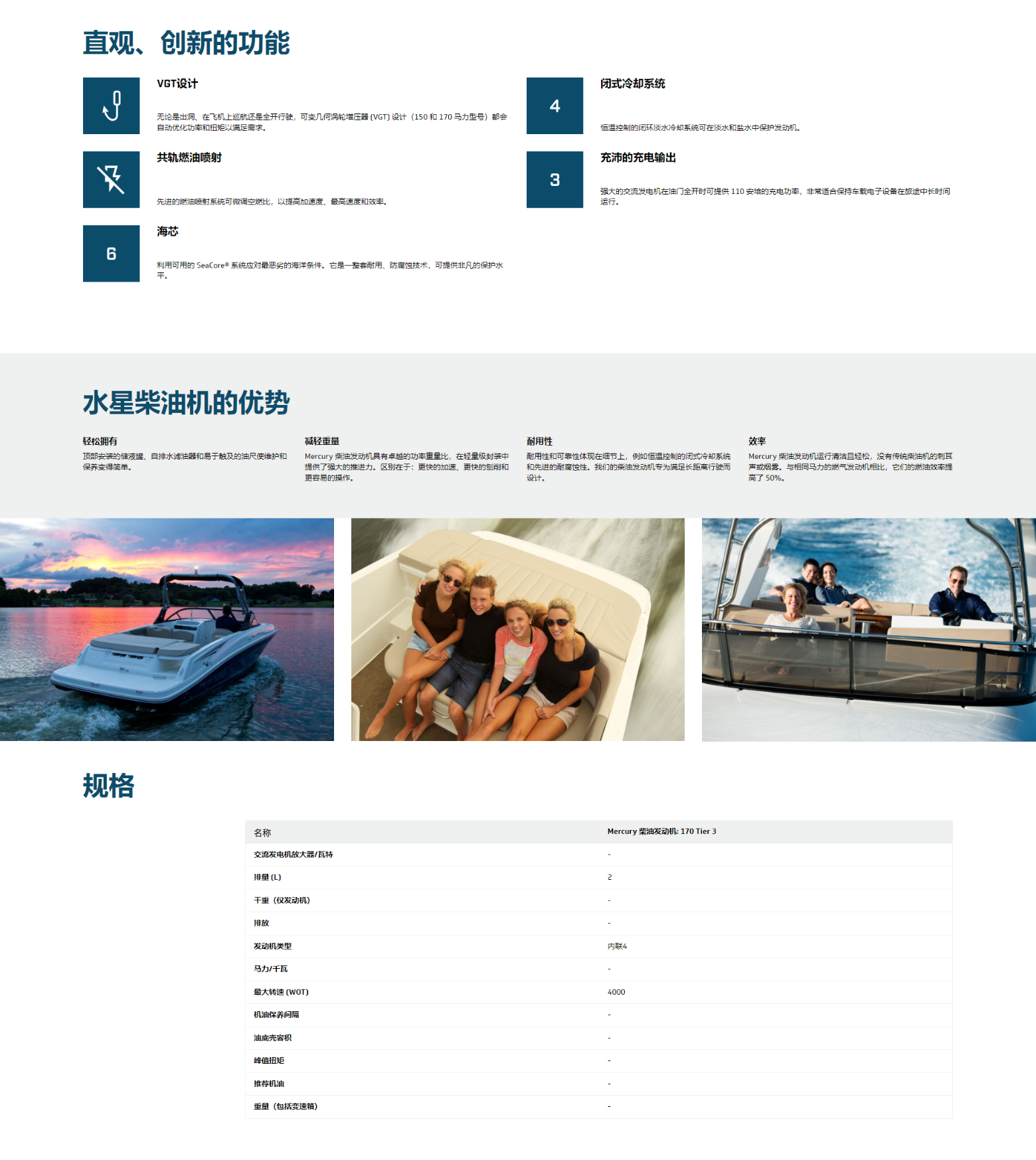 Mercury 2.0L 柴油发动机是一款紧凑型动力发动机,适用范围广,灵活性强,为您带来 Mercury Diesel 流畅、高效的性能和轻松的航行体验。